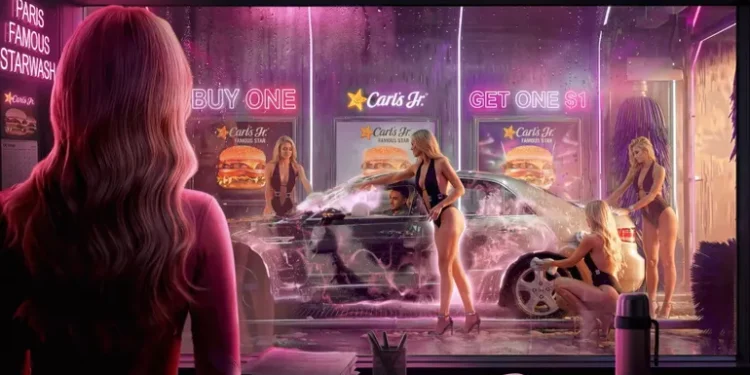 In the brand’s latest ad, two guys take their automobile to Paris’ Famous Starwash, a automobile wash operated by a handful of bikini-clad, electric-eyed Hilton clones. After the bogus intelligence-generated automobile wash sequence, the ad ends on the actual Hilton, who offers consumers a buy one, get one for $1 Famous Star burger deal.